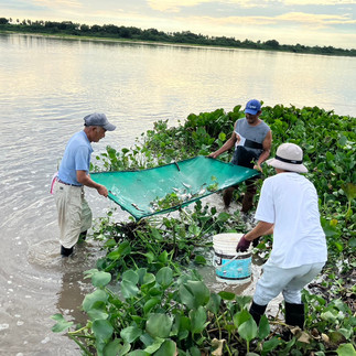 カナン基地はパラグアイ川の主流にはなく、支流に数百メートルくらい入らなくてはいけません。その支流は水草に覆われており、浅い場所もあったので、アルミボートを運転していたレイナルドは水草を分け、時々プロペラに絡まった水草を取り除き、浅い部分はモーターを上げてオールで漕いだりしながら、カナン基地に辿り着きました。レダ基地からボートで約30分くらいの旅でした。